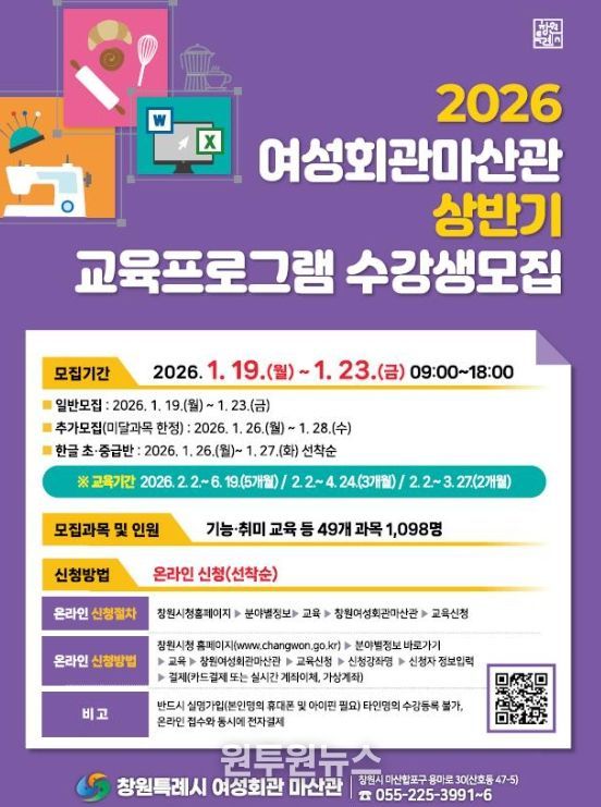 (원투원뉴스) 창원특례시 여성회관 마산관은 1월 19일부터 1월 23일까지 2026년 상반기 교육프로그램 수강생을 모집하여 2월 2일부터 6월 19일까지 교육을 실시한다고 밝혔다.