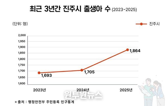 지난 5일 행정안전부의 주민등록 인구통계 발표에 따르면 진주시의 주민등록 출생아 수는 2023년 1693명으로 저점을 찍은 후, 2024년 1705명, 2025년 1864명으로 뚜렷한 증가세를 보였다.