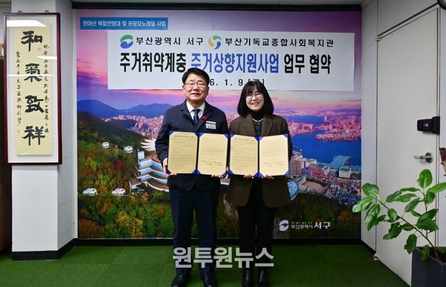 (원투원뉴스) 부산 서구와 부산기독교종합사회복지관(관장 김정자)은 지난 9일 2026년 주거 취약계층 주거상향지원사업 업무협약을 체결했다.