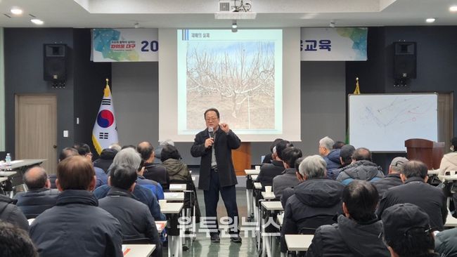 교육 첫날에는 청도복숭아연구소 김대홍 연구실장이 복숭아 병해충 관리를 주제로 강의를 진행했다. 이어 1월 7일에는 현해남 제주대학교 명예교수가 토양과 비료를 중심으로 합리적인 시비 관리와 토양 개선 방안을 설명했다. 8일에는 대구 사과 주산지인 동구 평광동 마을회관에서 한수곤 경북농민사관학교 사과다축형 재배기술과정 주임교수가 사과 다축재배 기술을 소개하며 현장 적용 사례를 공유했다.