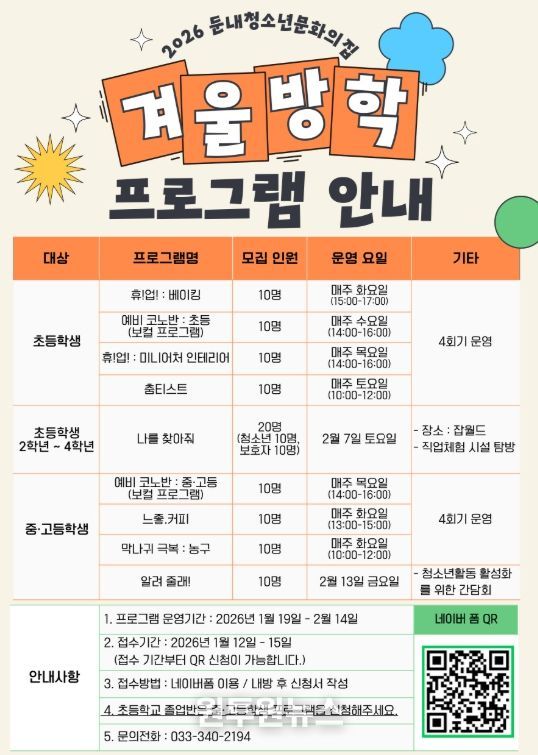 (원투원뉴스) 둔내청소년문화의집이 다가오는 겨울방학을 맞아 지역 청소년들의 소질 계발과 유익한 여가 선용을 위한 ‘2026년 겨울방학 프로그램’ 수강생을 모집한다.