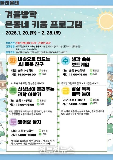(원투원뉴스) 제주도교육청 제주도서관은 겨울방학을 맞아 20일부터 2월 28일까지 초등학생들을 대상으로 ‘2026년 놀래올래 겨울방학 온동네 키움 프로그램’을 운영한다.