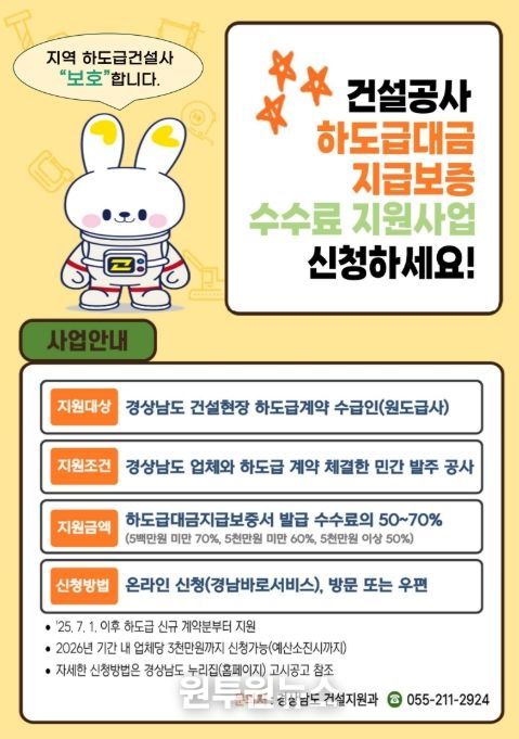 (원투원뉴스) 경상남도가 건설 산업의 활력을 높이고 하도급 업체 보호하기 위해 ‘2026년 건설공사 하도급대금 지급보증 수수료 지원사업’을 확대 추진한다고 밝혔다.