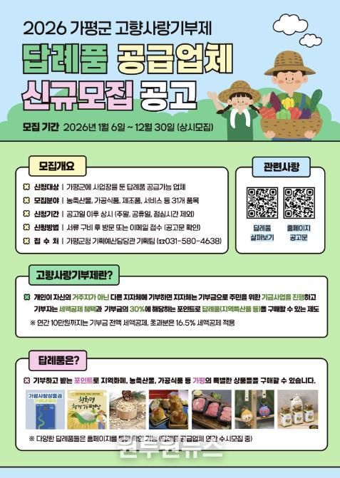 가평군은 1월 6일부터 12월 30일까지 고향사랑기부제 답례품 공급업체를 상시 모집한다고 12일 밝혔다. 이번 모집은 기부자에게는 다양하고 품질 높은 답례품을 제공하고, 지역 농가와 기업에는 새로운 판로를 제공해 지역경제 활성화로 이어지도록 하기 위한 취지다.