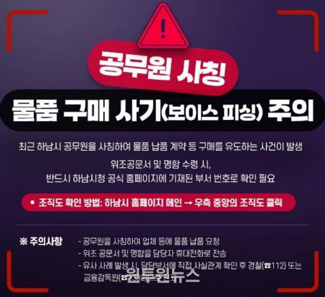 (원투원뉴스) 하남시는 최근 공무원을 사칭하여 관내 중소기업과 소상공인, 시민들을 대상으로 한 범죄 사례가 지속적으로 발생함에 따라 각별한 주의가 필요하다고 밝혔다.