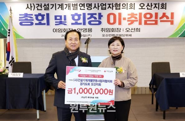 (원투원뉴스) 오산시는 사단법인 건설기계개별연명사업자협의회 오산지회가 저소득 취약계층 지원을 위한 이웃돕기 성금 100만 원을 기탁했다고 밝혔다.