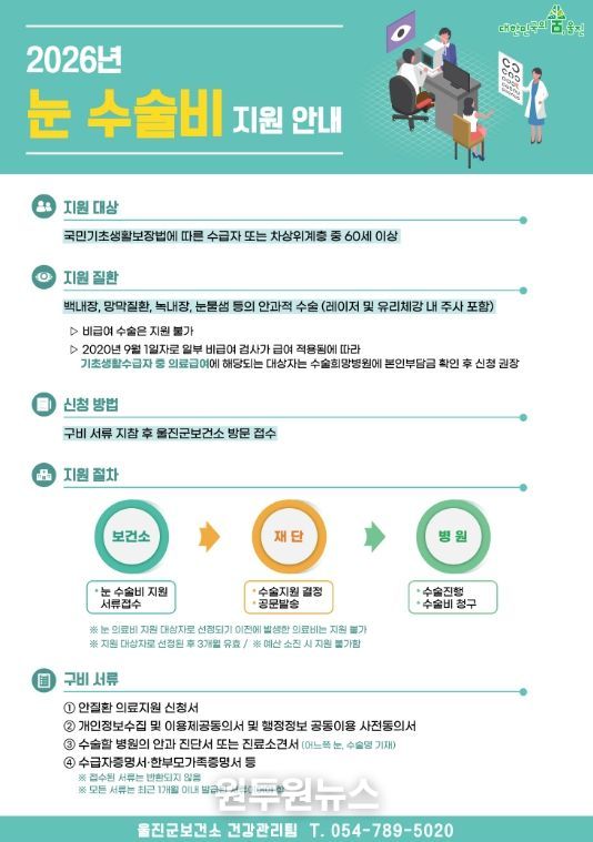 (원투원뉴스) 울진군은 60세 이상 저소득층 어르신을 대상으로 2026년 백내장 등 눈 수술비 지원사업을 추진해 노년기 시력 보호와 의료비 부담 완화에 나선다.