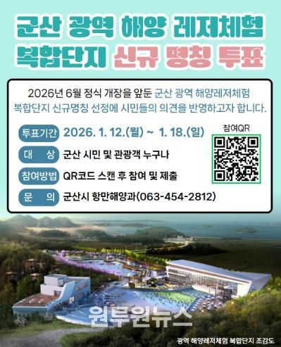 (원투원뉴스) 군산시가 군산 광역 해양레저체험 복합단지의 새로운 명칭과 관련한 시민 참여 선호도 조사를 18일까지 실시한다.