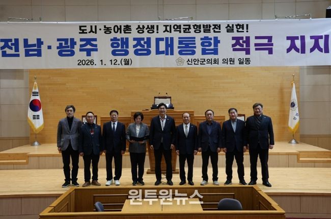 (원투원뉴스) 신안군의회는 12일 본회의장에서 전라남도와 광주광역시의 행정통합 추진을 적극 지지하는 성명서를 발표하고, 통합 논의가 선언에 그치지 않고 실행 단계로 이어질 것을 촉구했다.