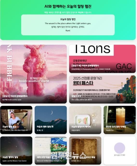 조성명 강남구청장은 “AI 힐링 웹진은 기술과 감성이 조화롭게 어우러진 강남구 디지털 혁신의 대표 사례”라고 평하며, “앞으로도 구민들이 언제 어디서든 따뜻한 위로와 재충전의 시간을 가질 수 있도록 차별화된 온·오프라인 힐링 콘텐츠를 지속적으로 발굴해 나가겠다”고 밝혔다.