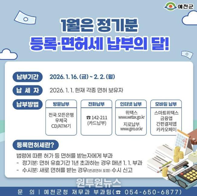 (원투원뉴스) 예천군은 정기분 등록면허세 13,922건, 1억 9천8백만 원을 부과했다고 13일 밝혔다.