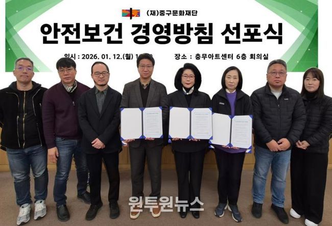 (원투원뉴스) 재단법인 중구문화재단이 지난 12일 충무아트센터 6층 회의실에서 ‘안전보건 경영방침 선포식’을 개최하고, 전 직원과 함께 안전한 근무환경 조성을 위한 경영 의지를 공유했다.