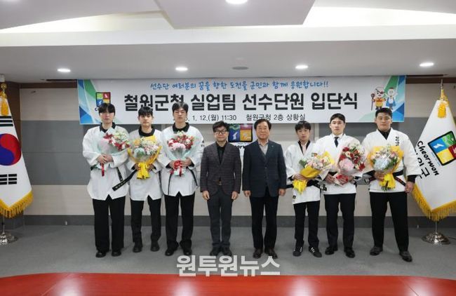 (원투원뉴스) 철원군은 1월 12일 11시 30분 철원군청에서 2026년 신규 및 재계약 유도 및 태권도 실업팀 선수 입단식을 개최했다.