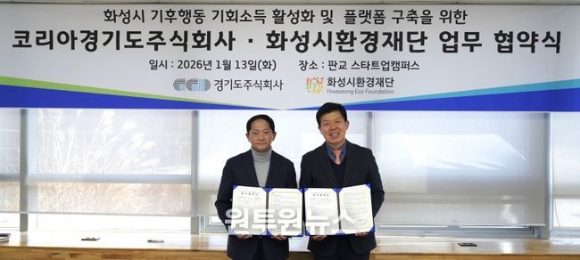 (원투원뉴스) 경기도주식회사는 13일 경기도 성남시 판교 스타트업캠퍼스에서 화성시환경재단과 ‘기후행동 기회소득 활성화 및 화성시 플랫폼 구축을 위한 업무협약’을 체결했다.