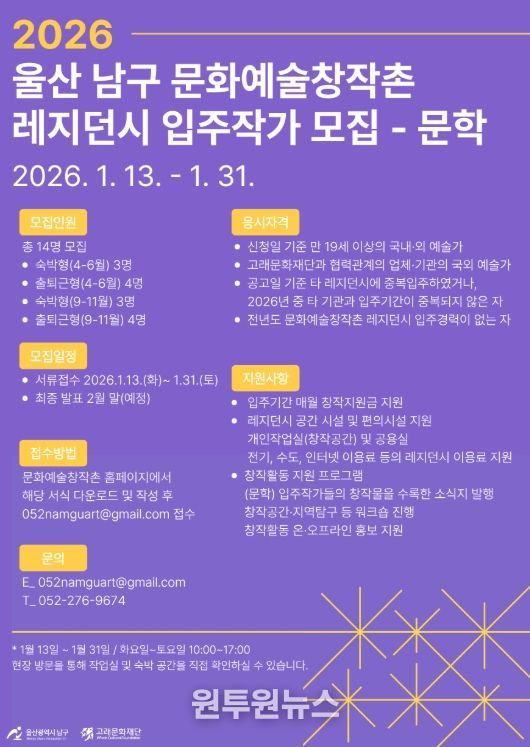 (원투원뉴스) 고래문화재단이 운영하는 울산 남구 문화예술창작촌이 2026년도 레지던시 사업에 참여할 입주작가를 1월 13일부터 1월 31일까지 공개 모집한다.