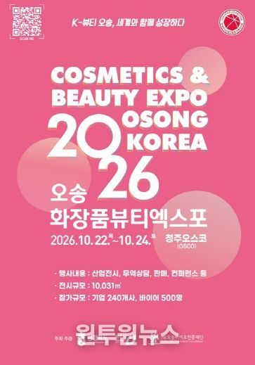 (원투원뉴스) 충북도와 청주시는 1월 14일부터 화장품·뷰티산업의 트렌드를 선도하고, 국내 화장품 기업의 판로 개척을 지원하는 ‘2026 오송화장품뷰티엑스포’의 참가기업 및 공식후원사 모집을 시작한다.