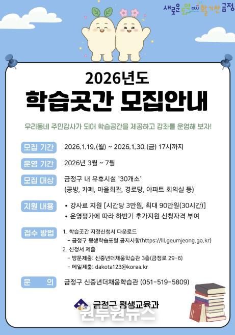 (원투원뉴스) 부산시 금정구는 구민의 근거리 학습권 보장과 평생학습 기회 확대를 위해 지역 내 유휴시설을 대상으로 1월 19일부터 1월 30일(17시)까지 학습곳간을 모집한다.