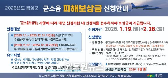 (원투원뉴스) 횡성군은 오는 19일부터 내달 28일까지 ‘2026년 군용기 소음피해 보상금’ 신청을 접수한다고 밝혔다.