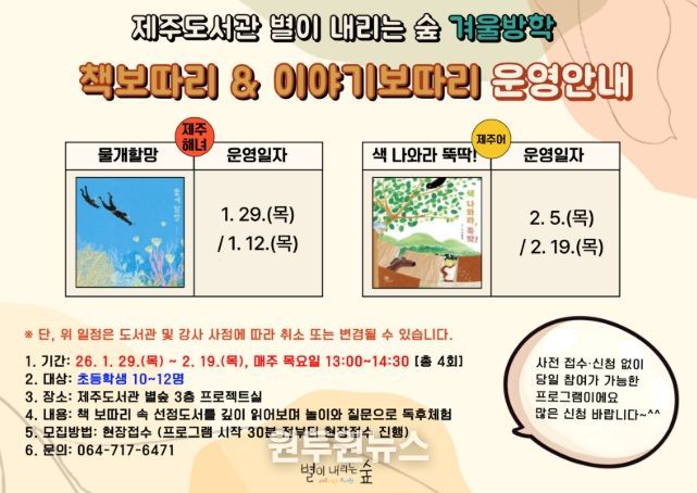 (원투원뉴스) 제주도교육청 제주도서관은 29일부터 2월 19일까지 제주도서관에서 겨울방학 동안 어린이들이 제주 문화를 깊이 있게 이해하고 독서의 즐거움을 느낄 수 있도록 체험형 독서 프로그램 ‘겨울방학 책 보따리&이야기 보따리’를 운영한다.