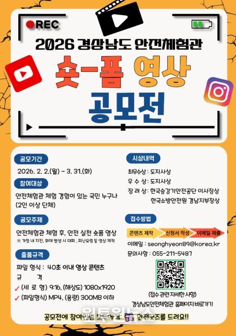 공모 기간은 2026년 2월 2일부터 3월 31일까지다. 안전체험관에서 1회 이상 체험한 경험이 있는 국민이면 누구나 참여할 수 있으며, 2인 이상 단체로 구성해 40초 이내 세로형 숏폼 영상을 제작해 참가 신청서와 함께 이메일로 보내면 된다.