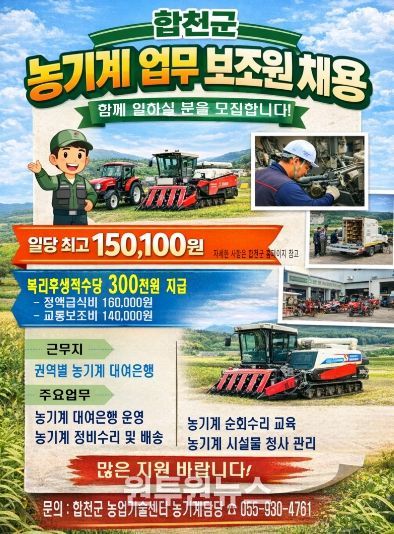 (원투원뉴스) 합천군은 농기계대여은행 운영체계를 강화하고 농업인 영농 편의를 높이기 위해 2026년 농기계 업무보조원 기간제근로자 9명을 채용한다고 14일 밝혔다.