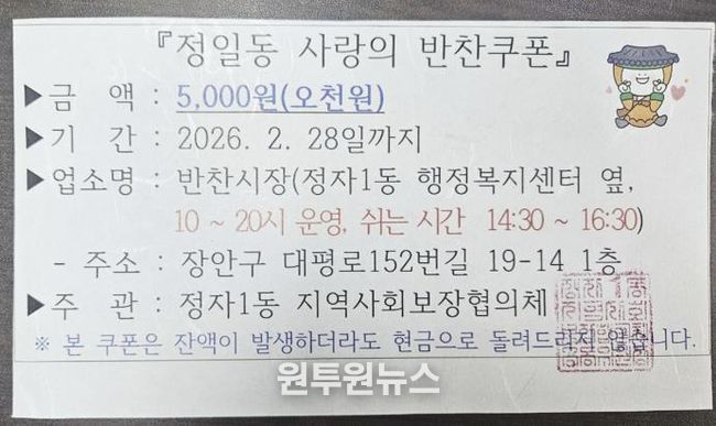 (원투원뉴스) 수원시 장안구 정자1동 지역사회보장협의체는 금년부터 관내 취약계층 가구를 대상으로 매월 5가구에 2만원 상당의 반찬쿠폰을 지급하는 사업을 시작한다고 지난 13일 밝혔다.