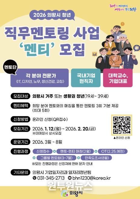 모집 대상은 의왕시에 거주하거나 관내 대학에 재학 중인 19세부터 39세까지의 청년으로, 안내문의 큐알 코드를 통해 신청할 수 있다.