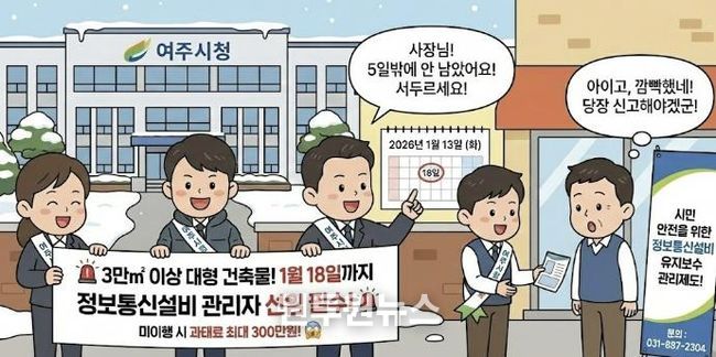 현재 여주시 내 연면적 3만㎡ 이상인 대형 건축물의 관리주체는 오는 2026년 1월 18일까지 정보통신설비 유지보수 관리자를 선임하고 지자체에 신고를 완료해야 합니다.