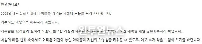 한편, 2020년 시작된 익명 기부자의 선행은 매년 논산시의 겨울을 녹이는 대표적인 미담으로 자리 잡았다. 시는 기부금 전달 과정에서 기부자의 익명성을 철저히 보장하면서도 그 따뜻한 영향력이 지역사회 전반으로 퍼져나갈 수 있도록 노력하고 있다.
