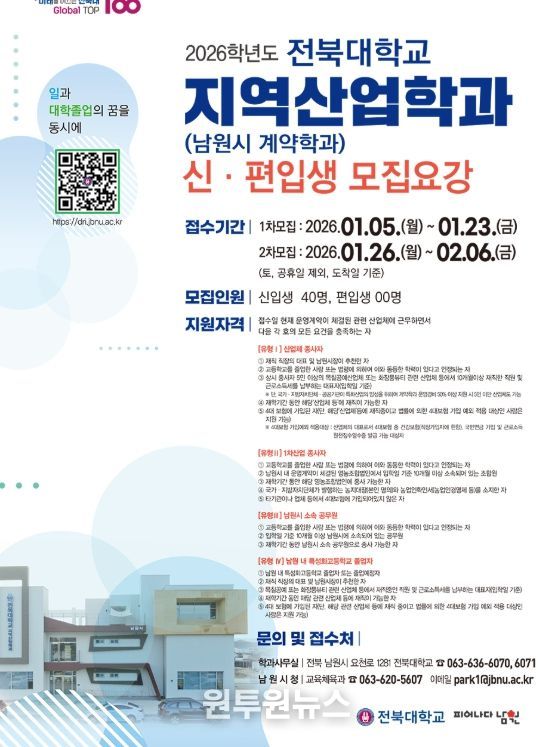 (원투원뉴스) 남원시(시장 최경식)와 전북대학교는 지역 특화산업 전문인력 양성을 위해 2026학년도 전북대학교 지역산업학과(남원시 계약학과) 신·편입생을 모집한다고 밝혔다.