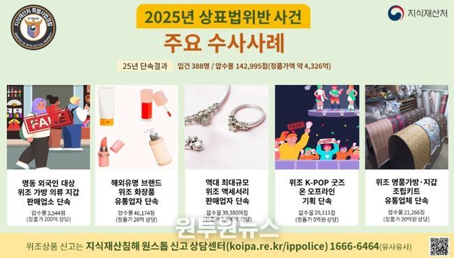 (원투원뉴스) 지식재산처는 지난해 상표권 침해와 위조상품 유통에 대한 전방위적인 단속을 통해, 상표권 침해사범 388명을 형사입건하고, 위조상품 약 143천여 점(정품가액 4,326억원 상당)을 압수했다고 밝혔다.