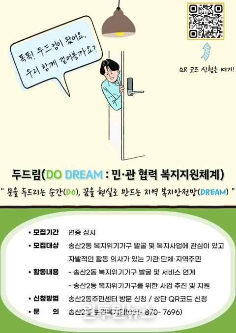 참여를 희망하는 기관‧단체‧지역 주민은 ‘두드림(DO DREAM) 모집’ 안내문을 통해 송산2동 주민센터에 문의하거나 QR코드를 통해 신청서를 제출하면 된다. 모집은 연중 상시 진행되며, 세부 사항은 송산2동 보건복지팀(031-870-7696)으로 문의하면 안내받을 수 있다.