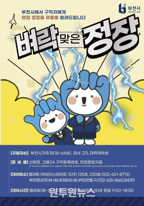 (원투원뉴스) 부천시는 취업을 준비하는 시민의 경제적 부담을 덜기 위해 ‘벼락 맞은 정장’ 면접정장 무료 대여사업을 지난해에 이어 올해도 지속 운영한다고 13일 밝혔다.