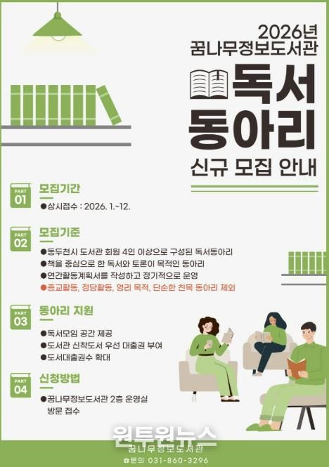 (원투원뉴스) 동두천시 도서문화사업소 꿈나무정보도서관은 시민들의 인문적 사고력 향상과 토론 문화 활성화를 위해 2026년 신규 독서동아리를 모집한다고 밝혔다.