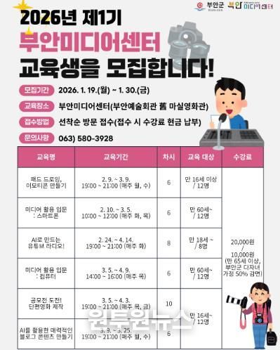 (원투원뉴스) 부안미디어센터는 군민의 미디어 활용 역량 강화를 위해 2026년 제1기 미디어교육 교육생을 모집한다고 밝혔다.