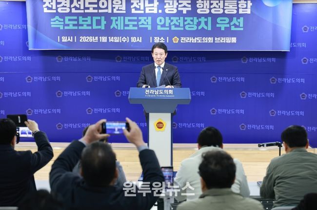(원투원뉴스) 전라남도의회 전경선 의원(더불어민주당·목포5)은 14일, 전라남도의회 브리핑룸에서 기자회견을 열고, 전남-광주 행정통합과 관련해 “통합의 큰 방향과 대의에는 동의하며 적극 지지하지만, 속도전 통합이 아닌 제도적 안전장치가 우선돼야 한다”고 밝혔다.