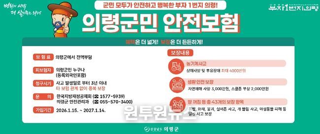 (원투원뉴스) 의령군은 일상생활 중 예기치 못한 재난과 사고로부터 군민의 생활 안정을 지원하기 위해 ‘2026년 군민안전보험’에 갱신 가입하고, 1월 15일부터 본격 운영에 들어간다고 밝혔다.