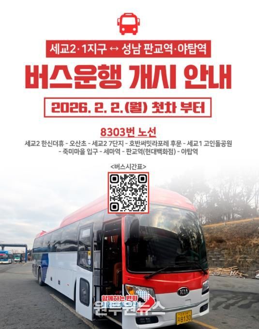이번에 신설되는 8303번 버스는 하루 2대가 투입돼 총 8회 운행된다. 세교1·2지구를 비롯한 오산 주민들의 수도권 남부 이동 편의를 크게 높일 것으로 기대된다. 특히 성남 판교·야탑 방면 직행 노선에 대한 시민들의 지속적인 요구를 반영해 마련된 노선이라는 점에서 의미가 크다.