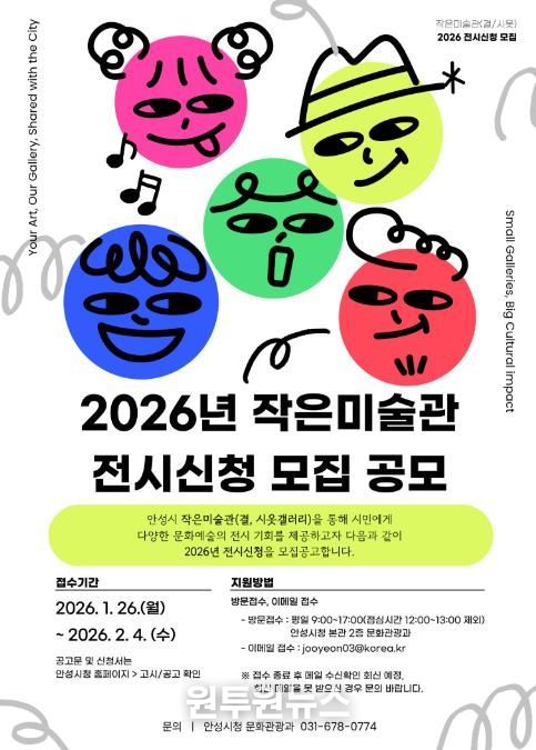 (원투원뉴스) 안성시는 이달 26일부터 2월 4일까지 ‘안성시 작은미술관(결·시옷갤러리) 전시 신청 모집 공모’을 개최한다고 밝혔다.