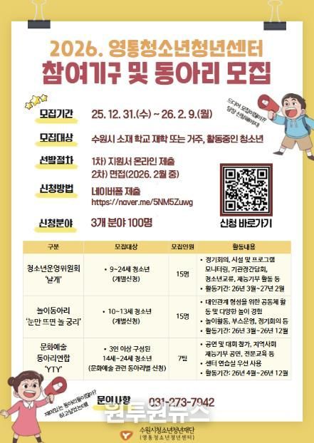 (원투원뉴스) 수원시청소년청년재단 영통청소년청년센터가 2026년 활동에 함께할 청소년 참여기구 및 동아리 참가자를 모집한다. 모집 대상은 청소년운영위원회, 놀이동아리, 문화예술동아리연합 총 3개 분야이며, 선발 인원은 약 100명이다.