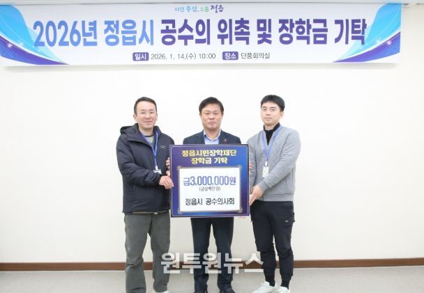 (원투원뉴스) 정읍시 공수의사회(정읍분회장 김진만)가 지역의 미래를 이끌어갈 우수 인재 육성에 힘을 보태기 위해 14일 정읍시민장학재단에 장학금 300만원을 기탁했다.