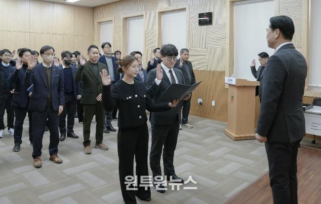 (원투원뉴스) 시흥도시공사는 지난 12일 공사 본사에서, 2026년 신년을 맞아 무재해, 인권경영 및 청렴윤리 실천, 개인정보보호에 대한 의지를 대내외적으로 표명하기 위한 ‘3대 경영의지 선포식’을 개최했다고 밝혔다.