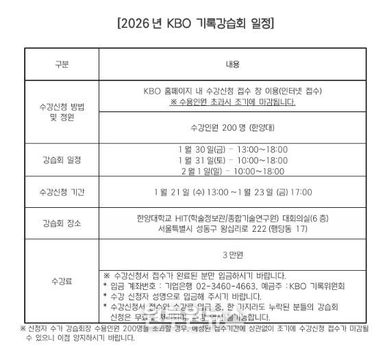 (원투원뉴스) 2026년 KBO 기록강습회가 1월 30일(금)부터 2월 1일(일)까지 서울 한양대학교에서 개최된다. 기록강습회는 야구 공식기록법의 보급과 이해를 통한 저변 확대를 목적으로 프로야구 원년인 1982년부터 개최됐다.
