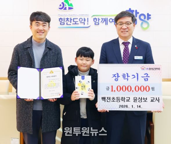 (원투원뉴스) (재)함양군장학회는 1월 14일 백전초등학교 윤상보 교사가 100만 원, 함양군 산림경영인협회(회장 김종문)에서 100만 원의 장학금을 기탁했다고 밝혔다.