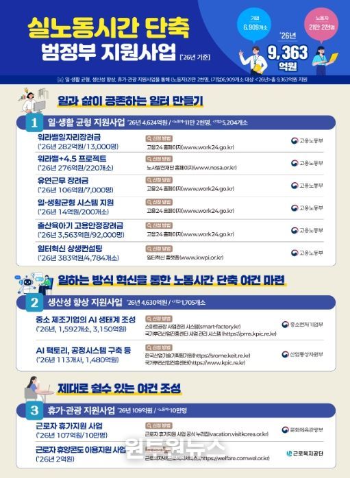 첫째, 노동자의 일‧생활 균형을 위해 11만 2천명에게 4,624억원을 지원한다. 대표적으로 올해 신설된 「워라밸+4.5 프로젝트」를 통해 노사 합의로 임금 감소 없이 주 4.5일제 도입 등 실노동시간을 단축하는 기업을 대상으로, 해당 노동자 1인당 연간 최대 720만원을 지원한다. 병원 등 생명‧안전 관련 업종, 교대제 개편 추진 기업, 비수도권 사업장에는 월 10만원을 우대 지원하고, 신규 채용을 확대하는 경우에는 노동자 1인당 연간 최대 960만원을 추가로 지원한다. 아울러, 투명한 노동시간 관리를 위해 출퇴근 관리 전산 시스템을 구축하는 사업장 200개소에는 설치비와 사용료를 포함해 최대 1천만원까지 지원한다. 또한, 실노동시간 단축, 교대제 개편, 유연근무 도입 등 일하는 방식 개선을 추진하는 사업장 4,784개소에는 전문 컨설턴트가 직접 방문해 무료 인사‧노무 컨설팅을 제공한다.