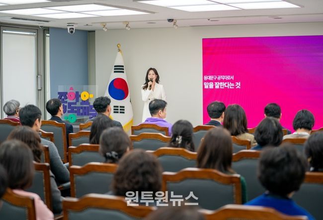 (원투원뉴스) 서울 동대문구는 14일 구청 5층 기획상황실에서 구청장과 6급 팀장 이상 관리자를 대상으로 ‘스피치 역량 강화 특강’을 열었다. 정책 설명과 내부 소통, 대민 응대 등 행정 현장에서 관리자의 말 한마디가 곧 조직의 신뢰로 이어지는 만큼, 공적 커뮤니케이션의 기본기를 점검하고 현장 적용력을 끌어올리기 위한 자리였다.
