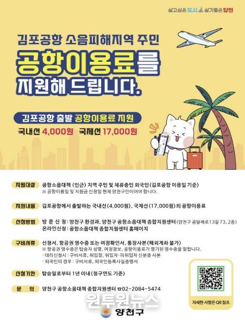 지원 대상은 공항 이용일과 신청일 기준 공항소음대책지역 및 인근 지역에 거주하는 양천구민으로, 김포공항에서 출발하는 항공편을 이용할 경우 국제선은 17,000원, 국내선은 4,000원을 1인당 연 4회, 최대 68,000원까지 지원한다.