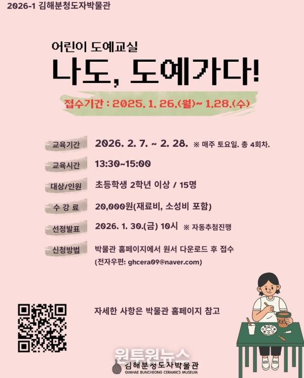 (원투원뉴스) 김해분청도자박물관은 겨울방학을 맞아 초등학생(2학년~6학년)을 대상으로 한 도예 체험 교육프로그램 '어린이도예교실-나도, 도예가다!' 의 교육생을 모집한다고 밝혔다.