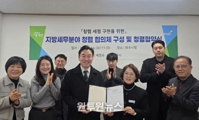 (원투원뉴스) 파주시는 지난 14일 파주지역세무사회(마을세무사)와 함께 청렴 문화의 정착과 확산을 위한 민관 청렴협의체를 구성하고, 청렴 실천을 위한 협약을 체결했다고 밝혔다.
