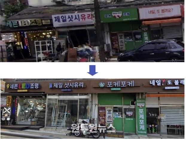 이를 바탕으로 12월 말까지 점포당 최대 300만 원을 지원해 총 51개 업소의 간판을 정비했으며, 보행에 지장을 주던 돌출 간판 44개를 철거했다.